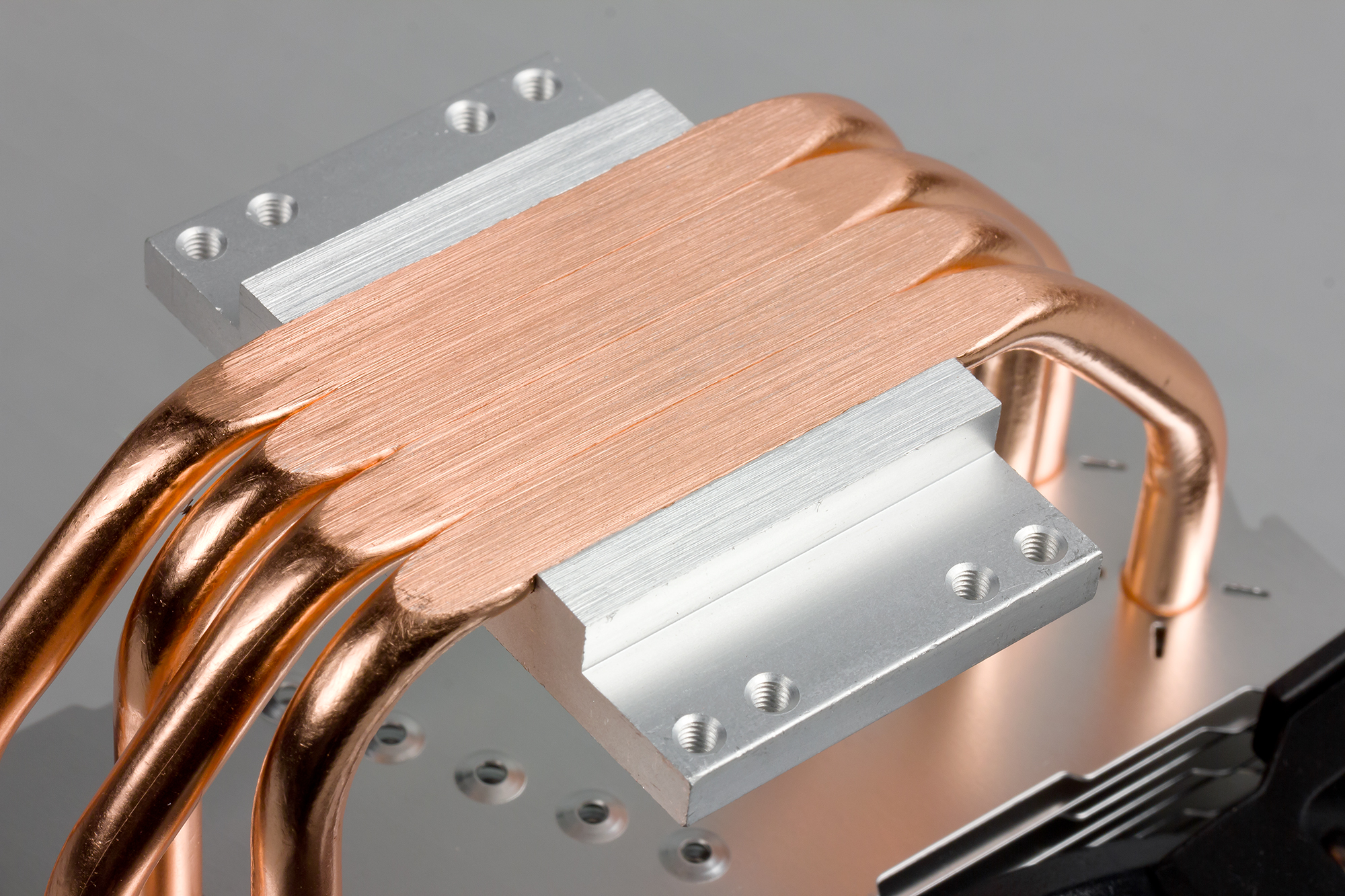 Кулер оснащен вынесенным радиатором, к которому тепло от подошвы передается по четырем тепловым трубкам. Трубки, разумеется, медные. У подошвы теплосъемника трубки сплющены и впрессованы в толстую алюминиевую пластину, снаружи анодированную.