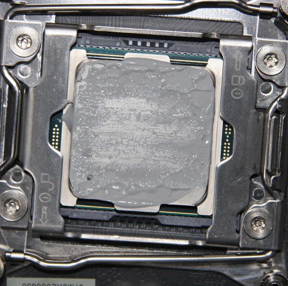 Преднанесенного термоинтерфейса нет, но производитель приложил к кулеру небольшой шприц с термопастой MasterGel Pro, количества которой явно хватит не на один раз. Забегая вперед, продемонстрируем распределение термопасты после завершения всех тестов. На процессоре: