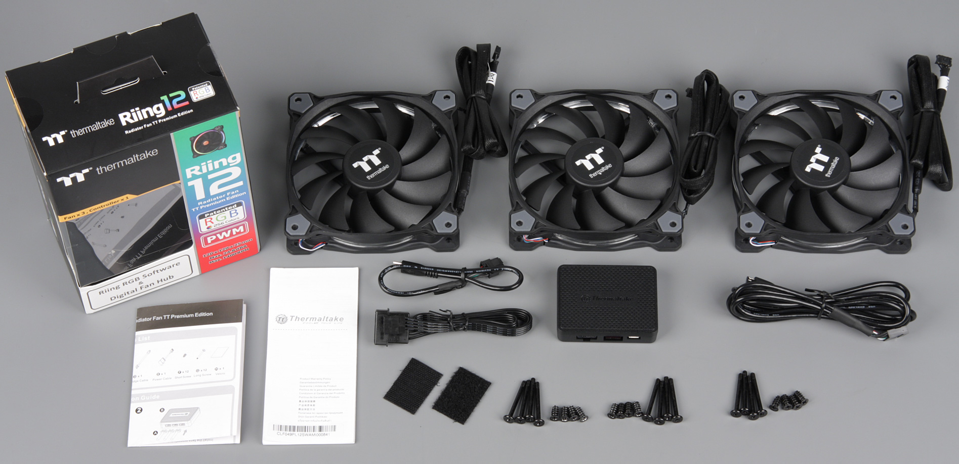 В комплект набора Riing 12 RGB Radiator Fan TT Premium Edition входят три описанных вентилятора, а также по четыре самореза и по четыре удлиненных винта (М3) к каждому вентилятору, контроллер, кабель питания для контроллера, кабель USB для контроллера и соединительный кабель для последовательного соединения контроллеров. Еще есть площадка-липучка с клейким слоем, видимо, для закрепления контроллера внутри корпуса, руководство (на английском языке) и описание гарантии.