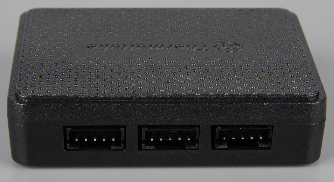 Исследование функций контактов показало, что первый контакт — это земля (общий контакт), второй — питание 12 В, третий — вход датчика вращения вентилятора, четвертый — выход управления с помощью ШИМ, а пятый, видимо, используется для управления подсветкой по какому-то варианту однопроводного интерфейса. В принципе, с помощью нужных переходников к контроллеру можно подключать обычные вентиляторы с управлением с помощью ШИМ, и наоборот, вентиляторы из набора Riing 12 RGB Radiator Fan TT Premium Edition можно подключать к стандартным четырехконтактным разъемам для вентиляторов, но в таком варианте функции управления подсветкой задействовать не получится.