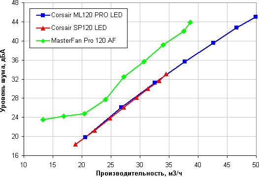 Максимальное давление создает вентилятор Corsair ML120 Pro LED Blue, минимальное MasterFan Pro 120 Air Flow, хотя его производительность в нашем тесте (напомним, с какой-то нагрузкой) выше, чем у Corsair SP120 LED Red. Впрочем, сам производитель позиционирует MasterFan Pro 120 Air Flow как оптимизированный для создания большого потока при небольшом давлении, что и отмечено в его названии — Air Flow (воздушный поток). Отметим, что большая величина статического давления позволит сохранить поток воздуха на приемлемом уровне в случае большой аэродинамической нагрузки, создаваемой, например, противопылевыми фильтрами в корпусе.