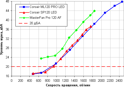 Если не принимать во внимание верхний предел по скорости вращения, то оба вентилятора Corsair ведут себя одинаково, тогда как вентилятор MasterFan Pro 120 Air Flow при равной скорости вращения заметно громче. Судя по характерному стрекотанию и низкочастотному гулу, на малых скоростях вращения вентилятора MasterFan Pro 120 Air Flow основной вклад в шум привносит работа контроллера, регулирующего скорость вращения.