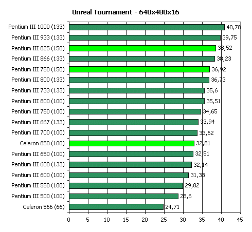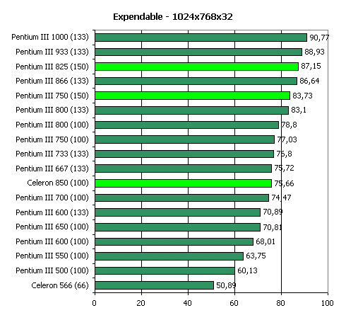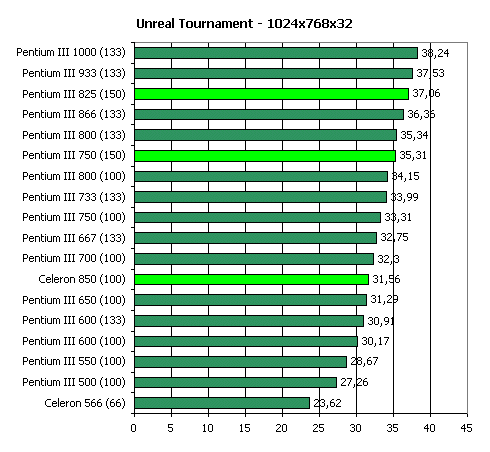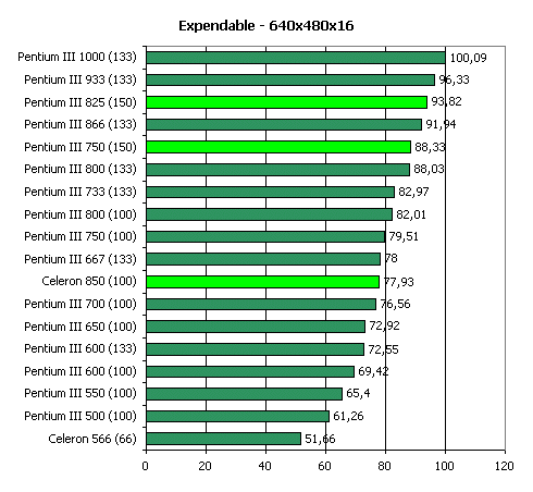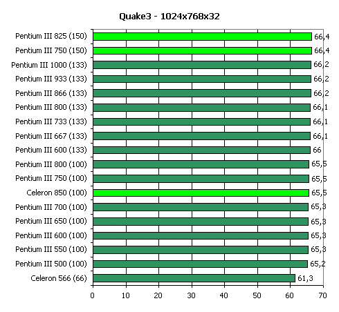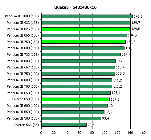 Кроме того, немалое значение в Quake3 в режиме High Quality имеет и пропускная способность шины памяти, откуда видеокарта черпает данные для рендеринга. Поэтому, 66-мегагерцовый Celeron в этом тесте отстает от остальных процессоров: при его использовании на плате на чипсете i440BX память также функционирует только на 66 МГц.