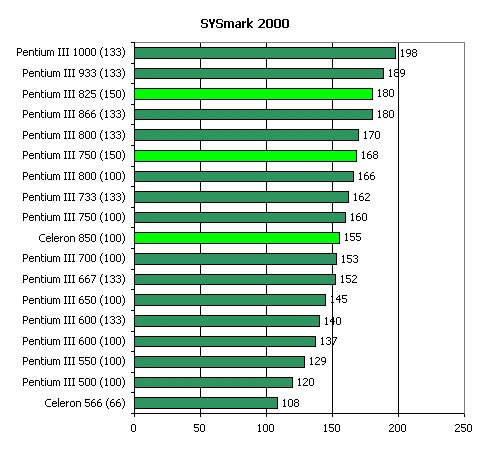 Результаты практически повторяют картину, которую мы видели в предыдущем тесте. Оно и не удивительно: и SYSmark и Winstone используют для измерения производительности наборы офисных приложений. Поэтому снова разогнанный до 750 МГц Pentium III 500 работает со скоростью, близкой к скорости Intel Pentium 800, а разогнанный до 825 МГц Pentium III 550 по производительности соответствует Intel Pentium III 866. И снова результат Celeron 566, функционирующего на 850 МГц при повышении частоты FSB до 100 МГц не так высок — его быстродействие чуть превосходит скорость 100-мегагерцового Intel Pentium III 700 и 133-мегагерцового Intel Pentium III 667.