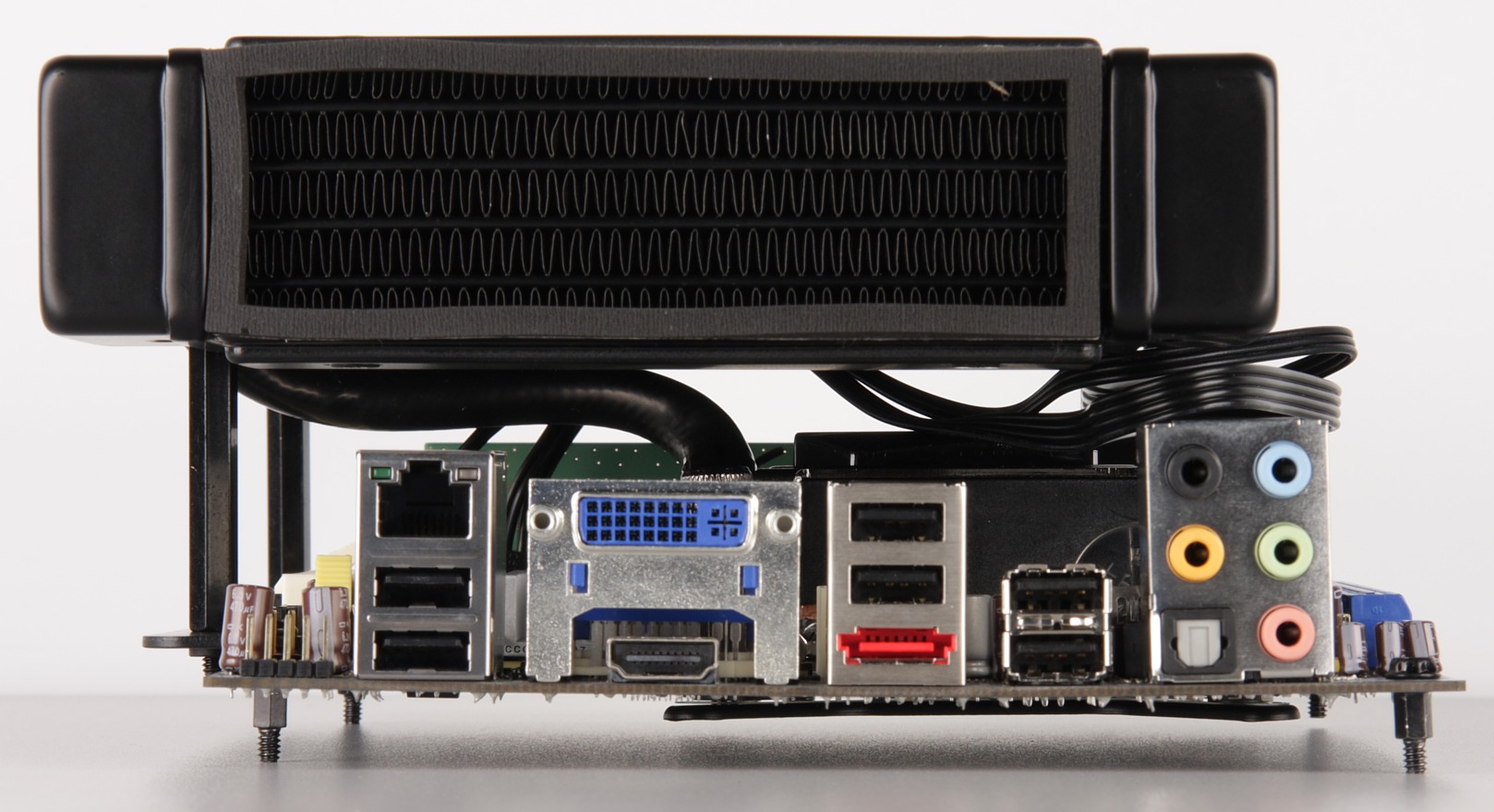 Сборка высокопроизводительных ПК в компактных корпусах представляет собой сложную задачу. Основная проблема заключается в обеспечении эффективного отвода тепла от греющихся компонентов с сохранением приемлемого уровня шума. И если в случае производительной видеокарты в большинстве случаев и даже в малогабаритных корпусах можно использовать штатную систему охлаждения, то в случае центрального процессора под мощный воздушный кулер во-первых, может просто не оказаться места, во-вторых, потребуется предпринимать особые меры для эффективной продувки корпуса, чтобы вывести весь нагретый кулером воздух из тесного пространства корпуса и обеспечить приток холодного снаружи. В такой ситуации компактные системы жидкостного охлаждения с вынесенным радиатором могу дать определенные преимущества, так как теплосъемник на процессоре имеет небольшие габариты, а вентилятор с радиатором выводят нагретый воздух сразу за пределы внутреннего объема корпуса и, создавая определенный уровень разряжения, дополнительно обеспечивают приток в корпус холодного воздуха извне. Главное, чтобы было куда разместить бутерброд из вентилятора и радиатора.