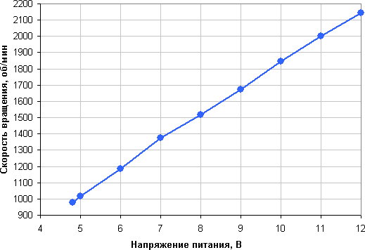 Здесь все без неожиданностей — почти линейный рост оборотов от напряжения во всем диапазоне. Управление с помощью напряжения позволяет незначительно расширить диапазон вниз до 977 об/мин. При этом 4,8 В является минимальным напряжением, при котором вентилятор как начинает вращаться при повышении напряжения, так и еще не останавливается при снижении. Получается, что управление с помощью ШИМ реализует практически весь диапазон скоростей, доступный для данного вентилятора. Поэтому для дальнейших тестов мы применяли этот способ управления.