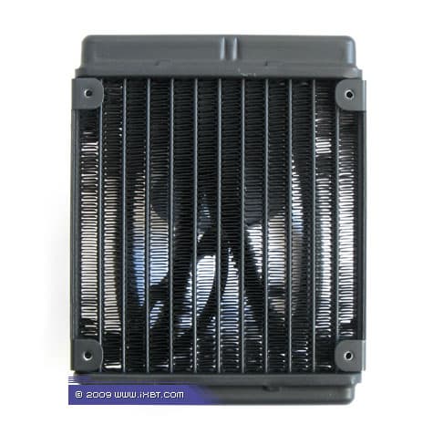 Конструктивные особенности (радиатор). «Рабочее тело» системы базируется на типичном «индустриальном» форм-факторе — радиатор составлен из стальных конструкционных элементов (предусмотрены 2 посадочных места для фиксации вентиляторов), пакета алюминиевых плоских трубок (11 шт) и медного оребрения (гофролента, 12 секций, общая площадь поверхности теплообмена порядка 3000 см2).