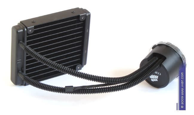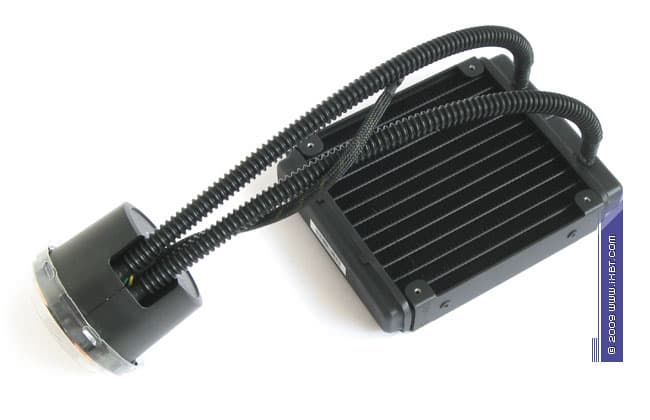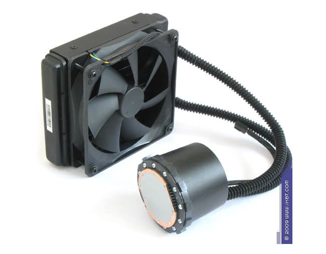Общетехническая характеристика. Система представлена неразборной композицией теплосъемного блока, гибких соединительных трубок и радиатора, который в процессе инсталляции дополняется комплектным вентилятором типоразмера 120×120×25 мм (допускается установка еще одного опционального вентилятора). Габариты радиатора 152×120×27 мм. Габариты теплосъемного блока 70×70×55 мм. Длина гибких трубок 30 см. Вес 695 г (без учета крепежа).