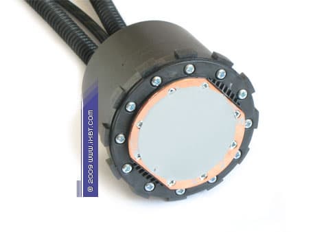 Конструктивные особенности (теплообменник и помпа). В рассматриваемой системе теплообменник интегрирован в «монолитный» рабочий блок, который образован связкой помпы и медной теплосъемной пластины (характерные размеры 53×46×12 мм).