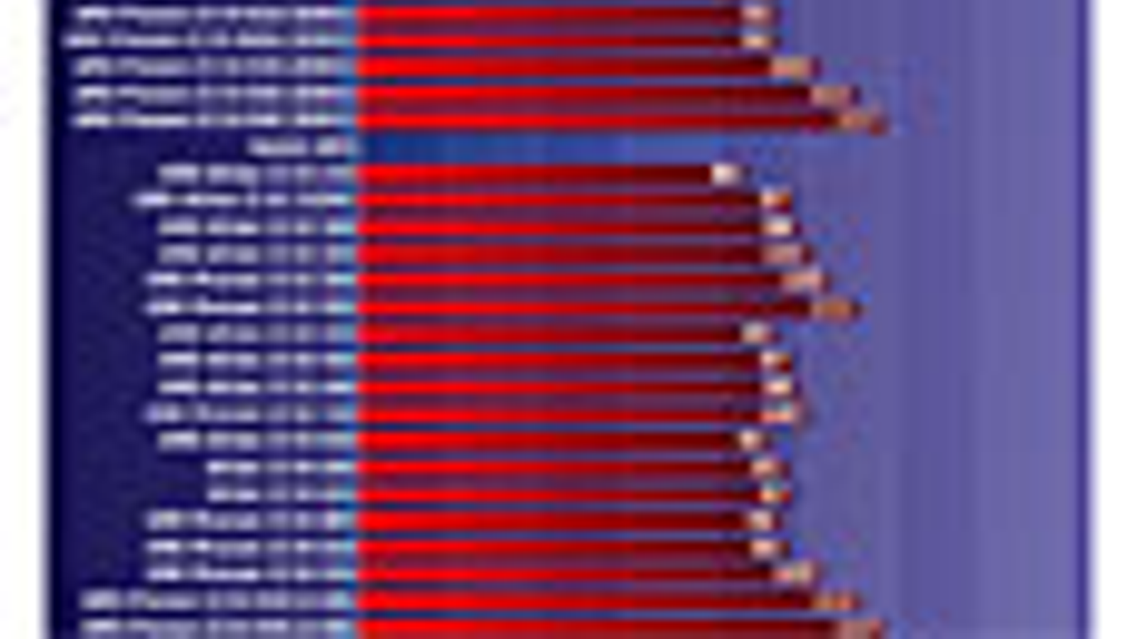 Разрыв уменьшается до 3,7 раз, что вполне объяснимо — Java-машина маловоприимчива к емкости кэш-памяти, что позволяет процессорам с низким ее объемом демонстрировать неплохие результаты.