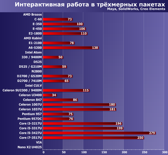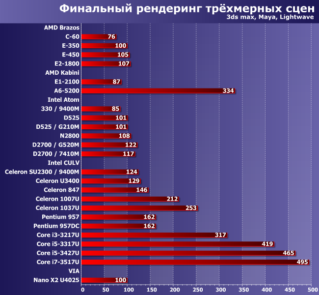 Часть систем эти тесты пройти не могла из-за требований к видеочасти. Заметим, что и попытка наделить Atom дискретным GPU тоже, в общем-то, ни к чему хорошему не приводит — в лучшем случае к конкуренции с C-60. Да и HDG второго поколения на том же уровне, а первого — еще в два раза медленнее, что в свое время вызвало определенный регресс CULV: варианты этой платформы с чипсетами от NVIDIA были быстрее. Настолько быстрее, что эти древние решения до сих пор не может догнать Brazos. Или, в лучшем случае, может только догнать, но не обогнать. А вот Core третьего поколения (пусть даже в бюджетных модификациях) — совсем иной уровень производительности. Не рабочие станции, конечно, на них получаются, но производительность в пару раз выше, чем у Brazos или старых представителей бюджетной части CULV-сегмента говорит сама за себя. Kabini, что тоже хорошо видно, каким-то прорывом не стал, однако старшие модели хотя бы заметно опережают Brazos. Но этого уже недостаточно для того, чтобы хотя бы догнать современный Celeron.
