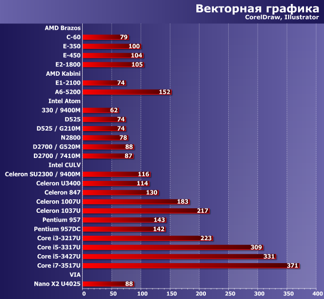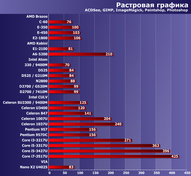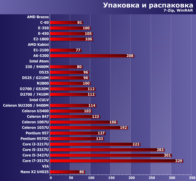 Большинство видеокодеков давно уже обрели способность загружать работой хотя бы четыре потока вычислений, так что нет ничего удивительного, что в этих случаях Atom до последнего времени выглядели неплохо. С другой стороны, эффективность формулы «2+НТ» сильно зависит от эффективности этих самых двух ядер: Atom это одно, а Core — совсем другое. Вообще же «водораздел» прослеживается четко: в область «до 200 баллов» попадает большинство продуктов прошлого, включая и младшие CULV-модели на Sandy Bridge. Выше — либо самые новые Celeron, либо четырехъядерные Kabini, либо Core. При этом i5 и i7 отрываются от уровня E-350 (который в этой линейке принят за базовый) в пять и более раз — в настольном сегменте такой разброс значений при равном TDP платформы не встречается: там все скромнее. А вот в ультрамобильных решениях, как видим, при сохранении других характеристик (но не цены готовых решений, разумеется) существенная разница в производительности легко может наблюдаться.