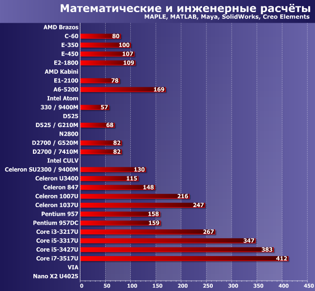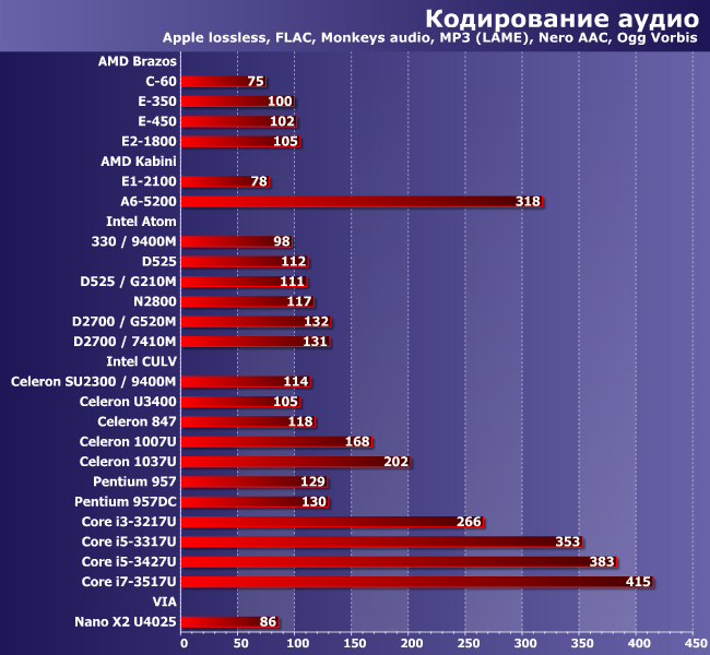 Общая картина сходна с рендерингом за исключением того, что А6-5200 уже не просто конкурирует с Core — некоторые модели он вообще обгоняет. Ничего удивительного — технология Hyper-Threading работает тем лучше, чем больше неоднородность выполняемых потоков кода, а ускорять четыре одинаковых лучше всего удается при наличии четырех независимых ядер. В данном же классе этому условию отвечают только Kabini и Bay Trail, но с последней платформой мы пока не знакомились.