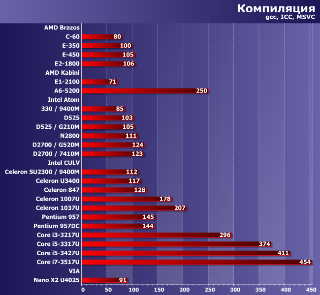 При тяжелой вычислительной нагрузке системы резко делятся на две группы — «полноценные» (пусть и низкопотребляющие) двухъядерные Core и четырехъядерный Kabini это одно, а все остальное можно и не рассматривать. Впрочем, прогресс заметен и на примере Celeron/Pentium — после перехода на Ivy Bridge такие модели начали демонстрировать неплохой уровень производительности, но всего два потока вычислений не позволяют им хоть как-то сравниться с лидерами. А Atom даже четырехпоточность позволяла в лучшем случае держаться на уровне Brazos или Celeron пятилетней давности. В общем, не их это стезя. Вот на Bay Trail с четырьмя ядрами (в старших моделях) обновленной архитектуры взглянуть будет, конечно, любопытно. Особенно на их противостояние с Kabini — ведь уже Celeron J1850 практически полностью идентичен A6-5200 по ТТХ, так что при их сравнении «лоб в лоб» все будет зависеть от архитектуры.