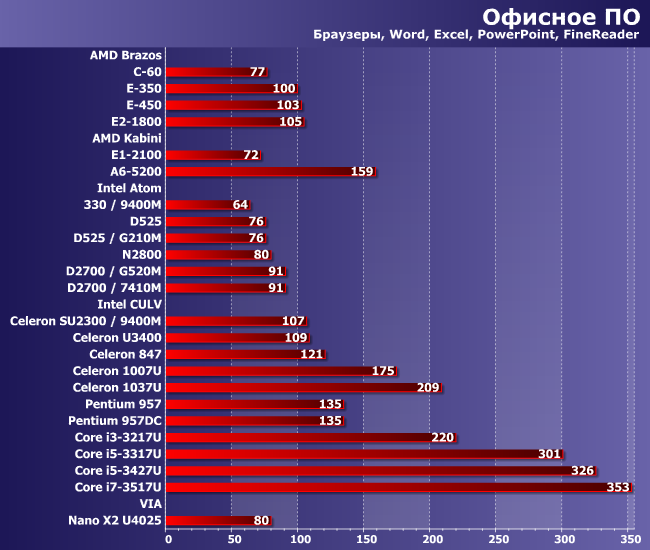Если для настольных систем какой-либо интерес может представлять собой разве что весьма прожорливый (и жадный до вычислительных ресурсов) FineReader, то пользователи компактных компьютеров до сих пор не избалованы их «избыточностью» при решении, казалось бы, элементарных задач, типа активного браузинга. Впрочем, основные претензии предъявлялись всегда к Atom и (в куда меньшей степени) Brazos, а более современные CULV-процессоры в два-три раза быстрее, чего уже как раз обычно достаточно. Но вот «избыточно» разве что в случае старших (и дорогих) ультрамобильных Core i5/i7, по быстродействию уже сравнимых с массовыми настольными или ноутбучными процессорами: в остальных случаях как максимум лишь «достаточно». Что на фоне старых Atom уже хорошо :)