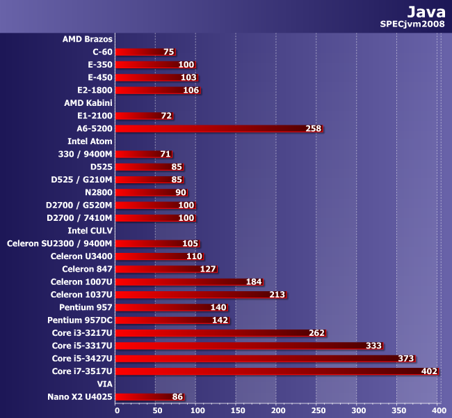 SPECjvm (как, впрочем, и многие другие тесты SPEC) в большей степени ориентирован на определение потенциального быстродействия разных систем — большая часть написанного на Java ПО оптимизирована куда хуже, поскольку сложных задач и не решает. Ну а потенциалом все ясно — желательно качественно поддерживать многопоточность (частью тестов используемую) и иметь высокую производительность каждого вычислительного потока. Причем одно другого не заменяет — Atom отстает от подавляющего большинства «обычных» двухъядерных моделей с «взрослой» архитектурой, а «настоящий» четырехъядерник A6-5200 лишь немного обгоняет бюджетные Celeron, но неспособен угнаться за современными Core, несмотря на то, что бенчмарк предпочитает физические ядра «виртуальной» многопоточности.