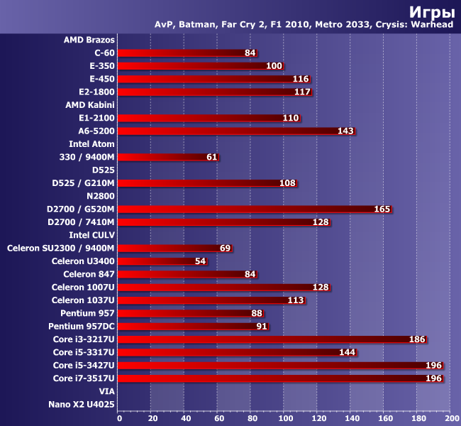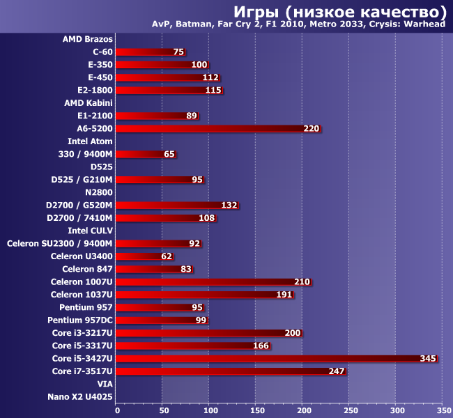 Как мы уже писали, некоторое время назад программисты Intel сумели нейтрализовать проблемы взаимного влияния процессорной и графической составляющей Core, что резко увеличило результаты в режимах низкого качества (в высоком ничего не изменилось, поскольку там все определяется только лишь GPU). Итог закономерный, хотя и интересный лишь для покупателей микросистем топового класса, коих и самих по себе не так много, и цены такой продукции высоковаты. Экономным же гражданам более важно то, что игровая производительность новых семейств процессоров обеих компаний радикально превосходит как уровень Brazos, так и «атомные» платформы с любым дискретным видео. На практике это выливается в то, что на Kabini или IB-Celeron в режиме минимального качества из используемых нами игр неприемлемую частоту кадров демонстрирует лишь Metro 2033, а на первой версии Ion (оригинальный Atom для мультимедийного применения серьезно рассматривать вообще смысла нет), к примеру, даже с такими настройками играть невозможно ни во что. Если только в проекты еще большей давности, чем наш набор, который уже (справедливо) критикуют за моральное устаревание :) Понятно, что из этого не следует пригодность таких систем для серьезного геймера (тут подойдет даже не всякая дискретка), но набор посильных бюджетным ноутбукам и мини-ПК игр за последнюю пару-тройку лет заметно расширился, что не может не радовать.
