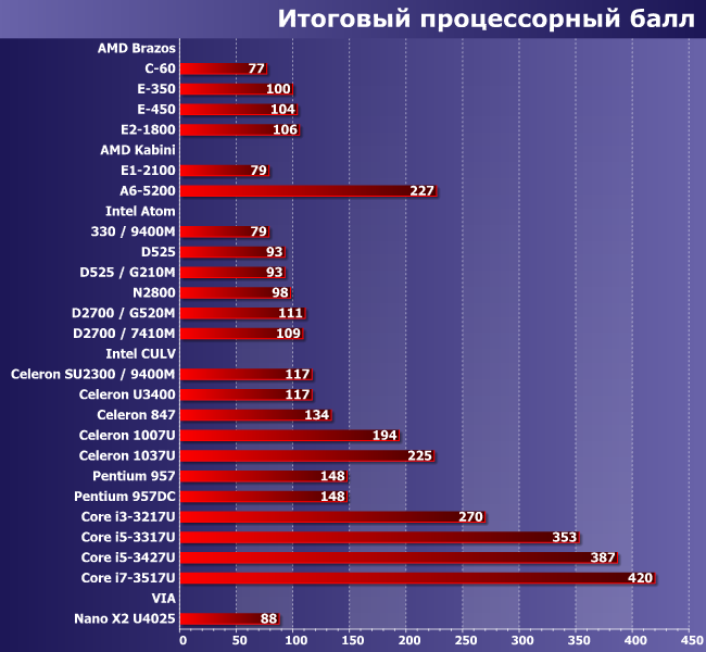Положение дел аналогичное — только разница между испытуемыми меньше. Но группы — сходные. Atom, Brazos и старые CULV на одном уровне, A6-5200 и новые Core — на другом. При этом, кстати, младшие Kabini относятся к первой группе, т.е. прогресс AMD во многом экстенсивный, в отличие от Intel, где увеличение производительности от поколения к поколению видно хорошо.