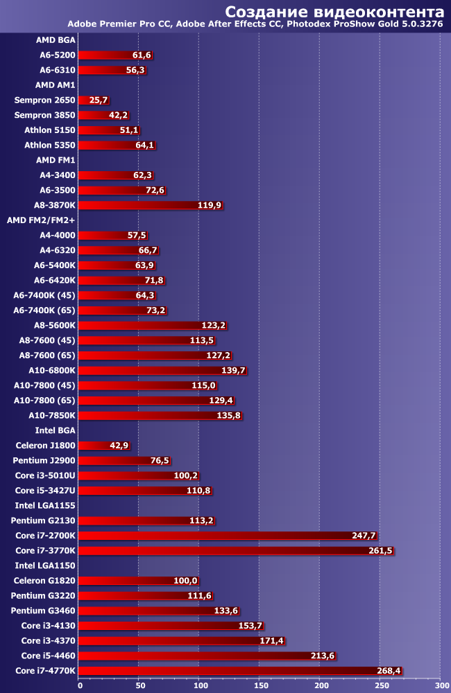 Степень утилизации многопоточности этими программами ниже, так что разлет на порядок можно обнаружить лишь между крайними точками (Sempron 2650 и Core i7-4770K), а подавляющее большинство процессоров AMD отстает уже даже от Pentium G3460. От более нового G3470, очевидно, отстанут все, а ведь AMD (в отличие от Intel) модельный ряд не обновляла давно и в ближайшее время не планирует. Да и старшие FX здесь по упомянутой выше причине слишком уж заметным образом положение дел изменить не могут.