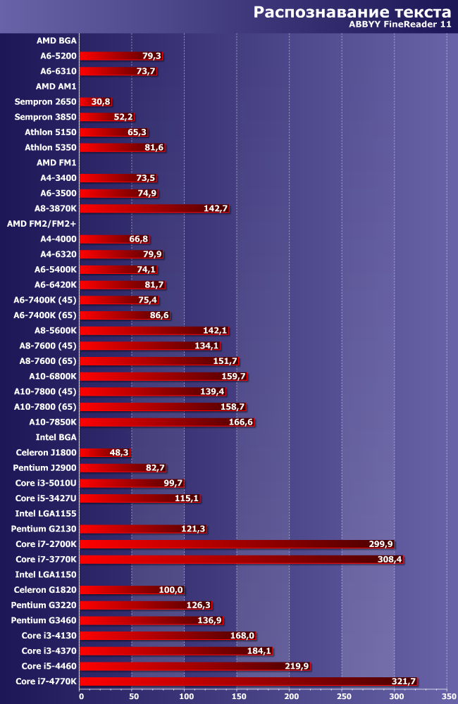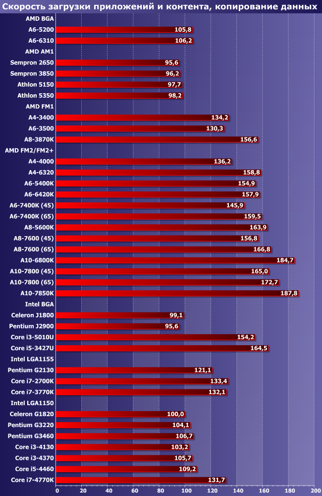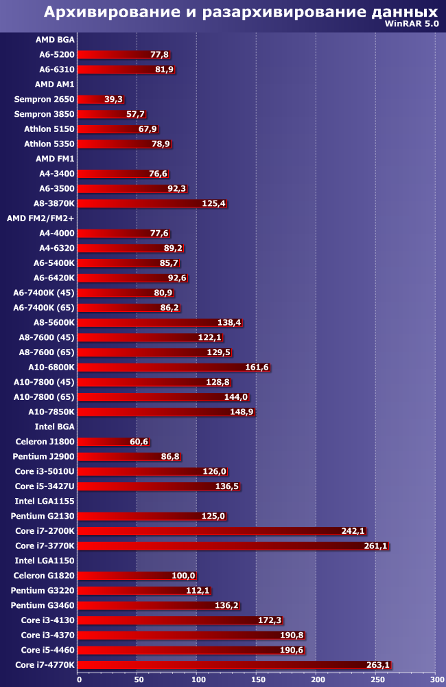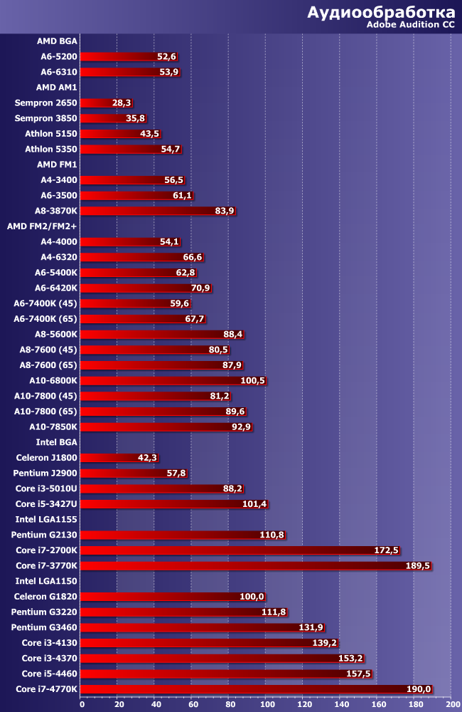 Программа способна загрузить все процессорные ядра, которые найдет, да и GPU задействует, так что наша «масштабная единица» в виде Celeron G1820 не так уж и велика. Однако, несмотря на это, процессоров набравших менее 100 баллов очень много — например, это все SoC AMD и Intel (хотя большинство их является четырехъядерными моделями), одномодульные процессоры AMD для FM2/FM2+ да и двух/трехъядерные модели под FM1 тоже. Два модуля AMD, как и следовало ожидать, практически эквивалентны двум ядрам Intel с Hyper-Threading, а на первых местах плотно окопались четырехъядерные Core i5/i7. Производительность самого быстрого Core i7-4770K на порядок превосходит Celeron J1800, Core i5-4460 в таких же отношениях состоит с Sempron 2650. И, кстати, самый быстрый из протестированных нами процессоров AMD отстает от Core i7-4770K тоже почти вдвое. Пилюлю могло бы подсластить участие в тестах трех и четырехмодульных процессоров AMD, но в эту тестовую линейку они не уложились ввиду отсутствия интегрированной графики, а с дискреткой мы никого не тестировали.