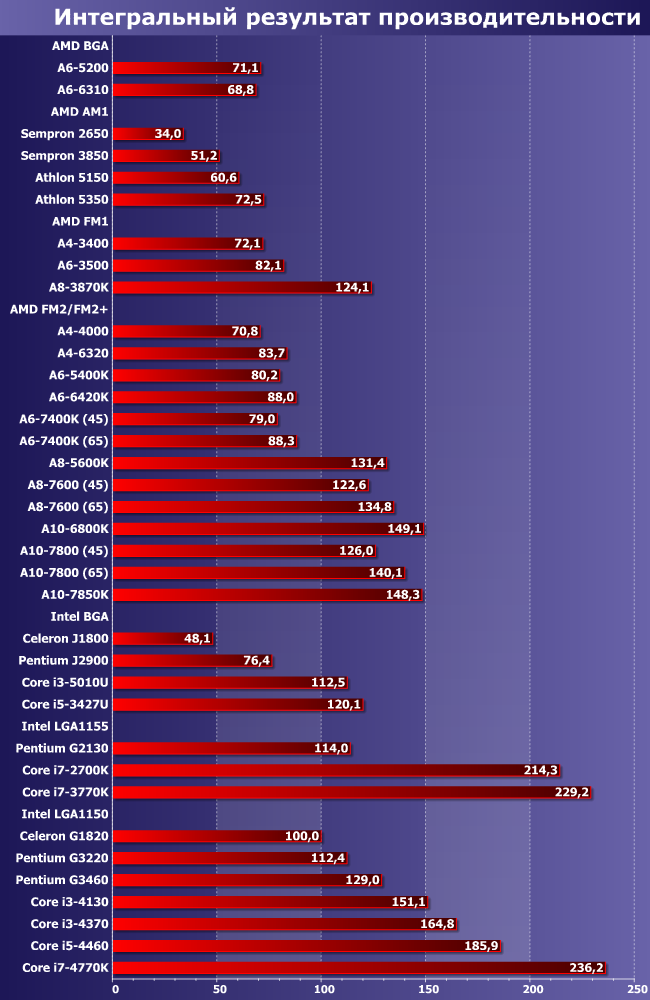Результаты протестированных процессоров укладываются в диапазон от 34 до 236 баллов, т. е. различаются примерно в семь раз. Заметим, что оба края диапазона относятся ко вполне современным устройствам — «герои вчерашних» в него тоже легко попадают. При этом и сейчас продаются как более медленные (например, ноутбучные Celeron на базе Bay Trail), так и более быстрые (многоядерные процессоры для LGA2011) процессоры. В конечном итоге можно утверждать, что производительность современных потребительских х86-процессоров различается более чем на порядок — если брать весь диапазон. Немудрено, что в результате они заполонили буквально все потенциальные сферы применения, и каждый пользователь вполне способен подобрать подходящее ему решение — по цене, производительности, размерам готовой системы в конце концов.