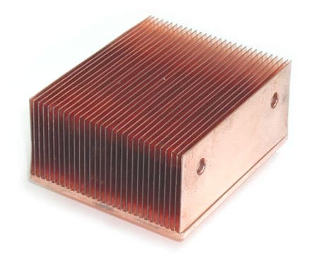 «Составные» радиаторы. Во многом повторяют методику «складчатых» радиаторов, но обладают вместе с тем весьма существенным отличием: здесь оребренная поверхность формируется уже не лентой-гармошкой, а раздельными тонкими пластинами, закрепленными на подошве радиатора пайкой или стыковой сваркой. Основной используемый материал — медь. Как правило, «составные» радиаторы характеризуются более высокой тепловой эффективностью, чем «экструзионные» и «складчатые», но это наблюдается только при условии жесткого контроля качества производственных процессов.
