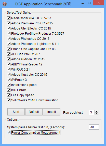 В нашей методике интеграция программно-измерительного блока с бенчмарком iXBT Application Benchmark 2016 заключается в том, что в каждом тесте синхронно с началом выполнения тестового задания запускается сбор данных измерительным блоком, а синхронно с моментом окончания выполнения тестового задания сбор данных прекращается. Результаты измерения сохраняются во временном файле и обрабатываются бенчмарком.