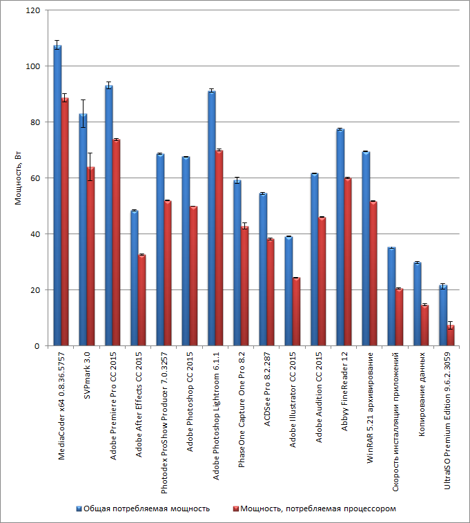 И когда в тесте выполняется несколько отдельных задач, непонятно, что именно понимать под потребляемой мощностью и энергопотреблением, поскольку в отдельных задачах потребляемая мощность различается. Можно, конечно, рассчитывать усредненную по всем задачам в тесте мощность и энергопотребление, однако результат будет напоминать среднюю температуру по больнице. Поэтому мы решили поступить следующим образом: в том случае, когда в тесте используется несколько отдельных задач, измерение мощности и энергопотребления производится только для самой энергоемкой задачи. Так, в тесте с использованием приложения Adobe Premiere Pro CС используется задача по экспортированию фильма. В тесте с применением приложения Photodex ProShow Producer тоже используется задача по экспорту проекта в фильм. В тесте с применением приложения PhaseOne Capture One Pro используется задача по пакетной обработке фотографий в режиме автоматического улучшения качества. В тесте с применением приложения Adobe Audition CС используется задача обработки аудиофайла путем применения к нему фильтра адаптивного шумоподавления. В задаче с использованием приложения WinRAR используется только задача по архивации.