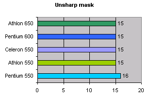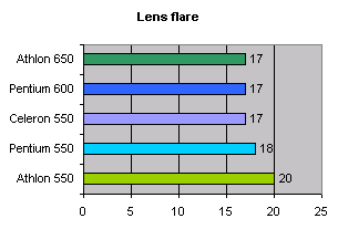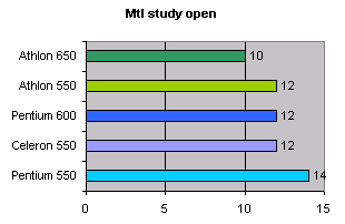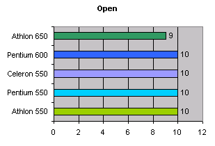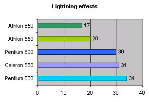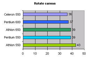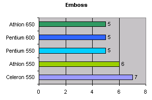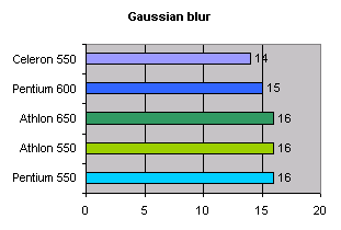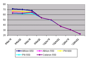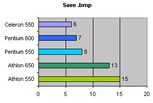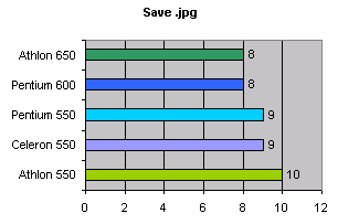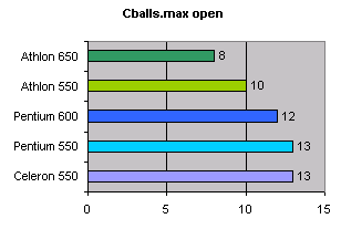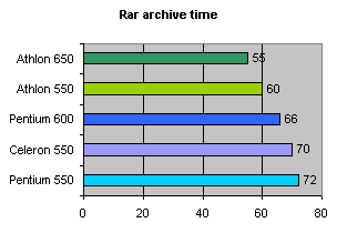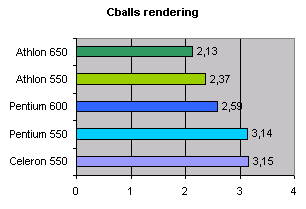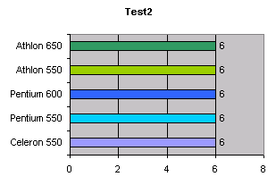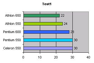 И здесь Celeron, как говорится, "on top". Почему? Сказать трудно. Вроде бы Athlon по все параметрам превосходит — кэш первого уровня у Athlon такого же размера как у Celeron второго и т.д., но Celeron 550 прошел этот тест за 14 секунд, а Athlon 550 — за 16…