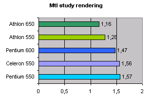 Вот и начало проявляться преимущество Athlon над Pentium III и Celeron — до 20%. Но все же открываются файлы не так часто. Теперь посмотрим, с какой скоростью процессоры осуществляют финальный рендеринг. Опции в этих тестах были следующими: