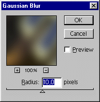 Gaussian Blur весьма часто используется всеми — от профессиональных дизайнеров до новичков, приклеивающих головы Ди Каприо к туловищу Шварценеггера и с помощью этого фильтра пытающихся скрыть швы :). Итак, фильтр Gaussian Blur применялся к полученному нами 50Mb изображению с радиусом 10:
