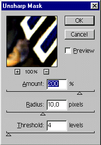 Этот фильтр является прямой противоположностью предыдущему и предназначен для "наведения резкости". Тем, кто не поленился и выполняет эти действия вместе с нами, еще раз напомню, что все тесты выполняются относительно исходного 50Mb файла и после полной перезагрузки компьютера. Итак, я применял Unsharp Mask со следующими параметрами: