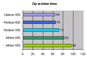 Вот это да! В этом тесте ситуация обратная: Celeron — лучший процессор для Winzip. Отсюда вывод - скорость архивирования зависит не только от мощности и навороченности кэшей процессора, но и от алгоритмов сжатия. И если они были оптимизированы под интеловские процессоры, то получается то, что мы видим.
