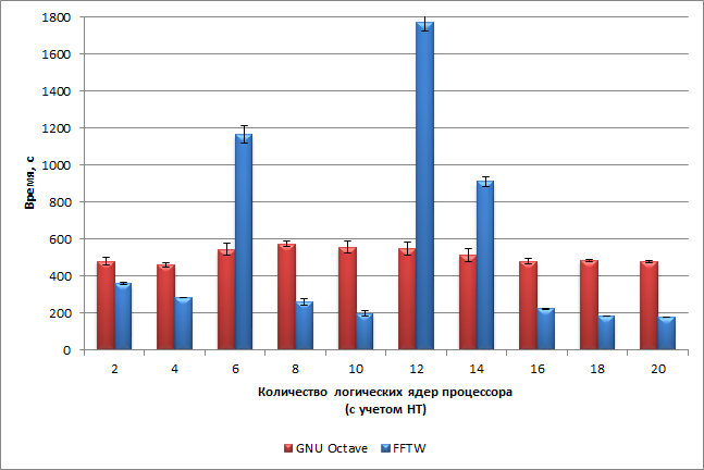 Есть еще одно замечание, которое можно сделать относительно приложений FFTW и GNU Octave при их использовании для тестирования. Пакет GNU Octave имеет плохую повторяемость результатов и для получения результата с низкой погрешностью желательно делать пять прогонов теста. Приложение FFTW дает более стабильные результаты, но и для этого приложения необходимо как минимум три прогона теста.