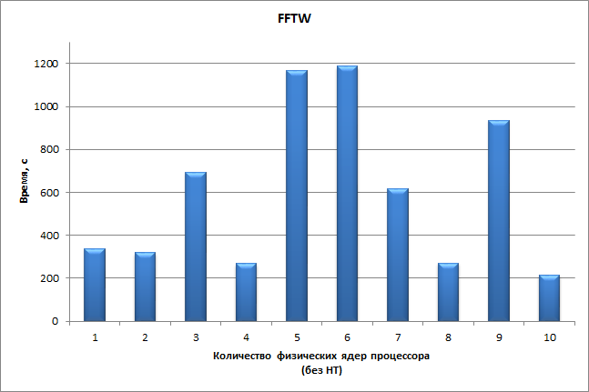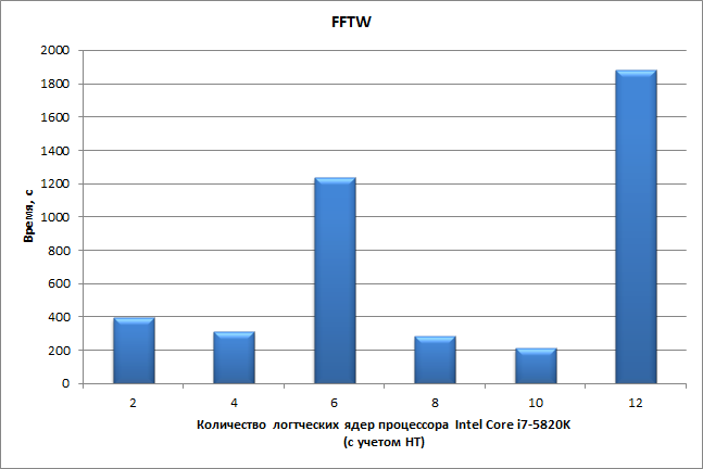 А вот с приложением FFTW все очень странно и нелогично. При 6, 12 и 14 ядрах (логических) время выполнения тестовой задачи становится аномально большим. В остальных случаях время выполнения тестовой задачи примерно одинаковое. Результат довольно странный, однако он многократно перепроверялся.