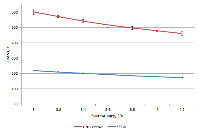 Как видно по результатам тестирования, и в пакете FFTW, и в пакете GNU Octave время выполнения теста зависит от частоты процессора. В пакете FFTW при увеличении частоты процессора от 3 до 4,2 ГГц (увеличение на 40%) время выполнения теста уменьшается на 21%. В пакете GNU Octave аналогичное увеличение частоты процессора приводит к уменьшению времени выполнения тестовых задач на 24%.