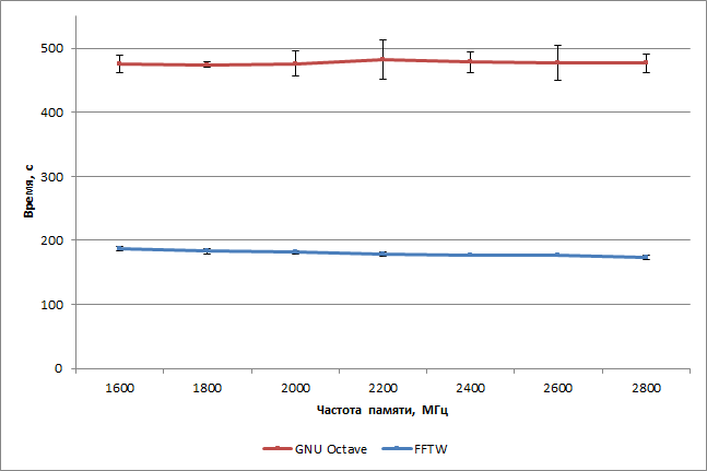 Наконец, было показано, что время выполнения тестовых задач в приложениях FFTW и GNU Octave никак не зависит от частоты памяти DDR4 (в четырехканальном режиме и в диапазоне от 1600 до 2400 МГц).