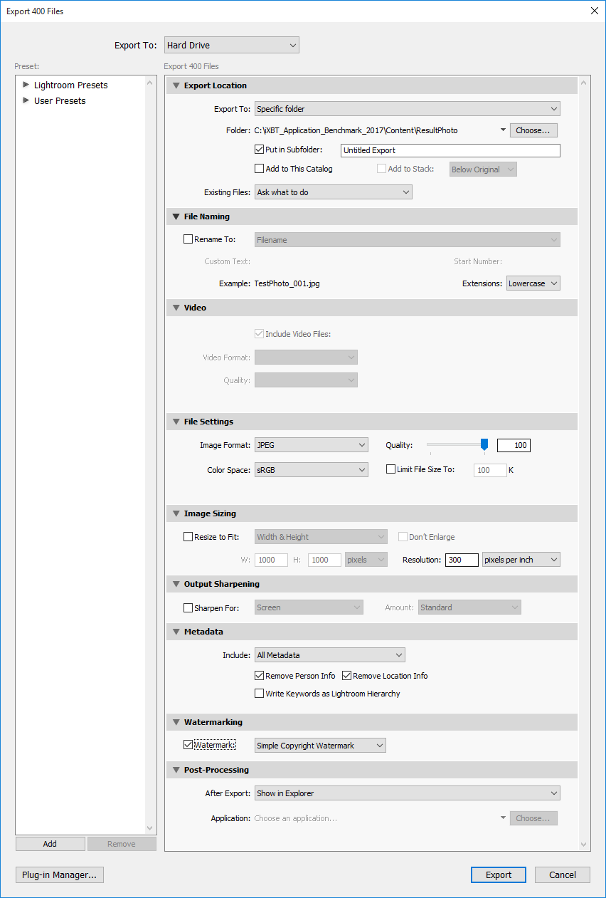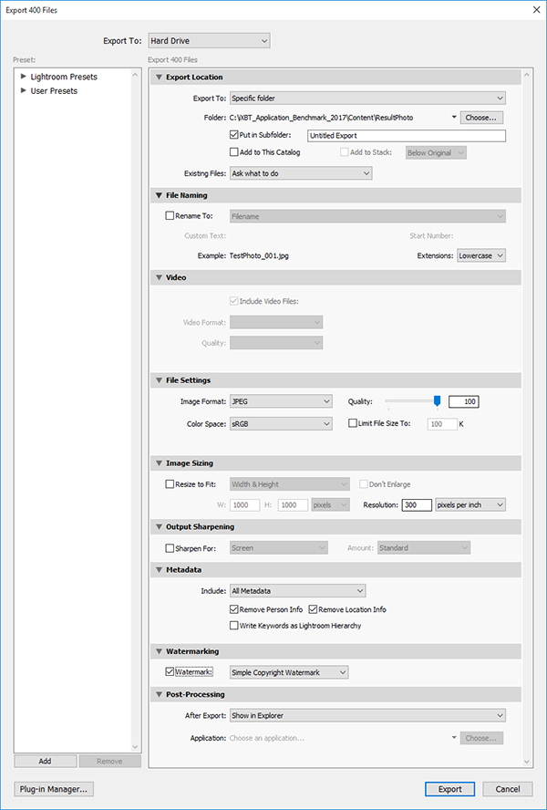 В тесте с применением приложения Adobe Photoshop Lightroom СС 2015.6.1 производится пакетная обработка 400 фотографий в формате JPEG, снятых любительской «мыльницей» Sony DSC-TX10. Исходные фотографии имеют разрешение 4608×3456 (или 3456×4608) и различный размер (от 2 до 6 МБ). Экспортирование каталога производится в формат JPEG с качеством 100% и разрешением 300 dpi.