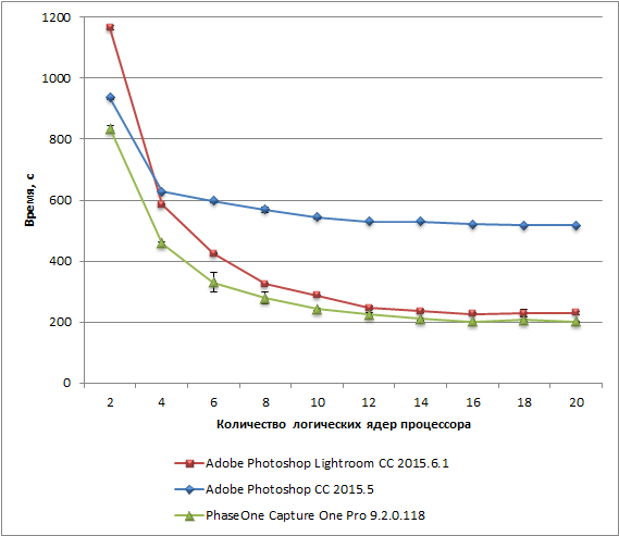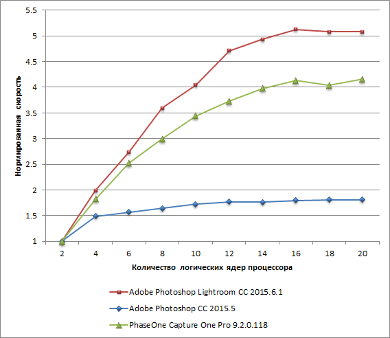 На примере 10-ядерного процессора Intel Core i7-6950X было показано, что скорость выполнения тестовых задач в приложениях Adobe Photoshop Lightroom и PhaseOne Capture One Pro возрастает при увеличении числа логических ядер процессора (с учетом Hyper-Threading) лишь до 16, после чего уже не меняется. В приложении Adobe Photoshop скорость выполнения тестовой задачи возрастает в 1,5 раза при переходе от 2 к 4 логическим ядрам, а при дальнейшем увеличении числа ядер процессора до 20 прирост скорости выполнения тестовой задачи составляет лишь 20%.