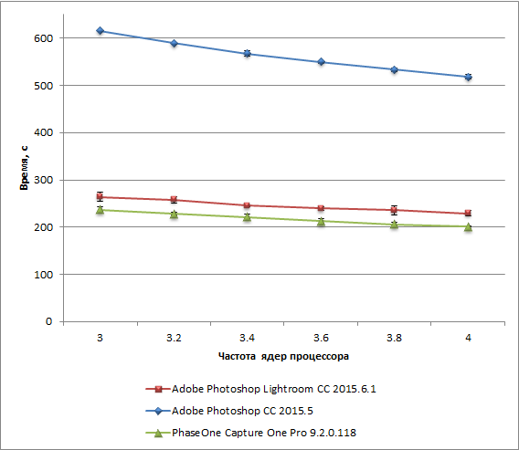 Как видно по результатам, время выполнения тестовых задач линейно меняется в зависимости от частоты ядер процессора. Увеличение тактовой частоты процессора на 33% приводит к сокращению времени выполнения тестовых задач примерно на 13% в приложении Adobe Photoshop Lightroom, на 16% в приложении Adobe Photoshop и на 15% в приложении PhaseOne Capture One Pro.