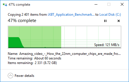 В тесте на определение скорости копирования данных измеряется время копирования тестовой директории размером 9,52 ГБ, содержащей различные типы данных, из одного места на системном накопителе в другое место на этом же накопителе. Копирование производится средствами операционной системы Windows 10.