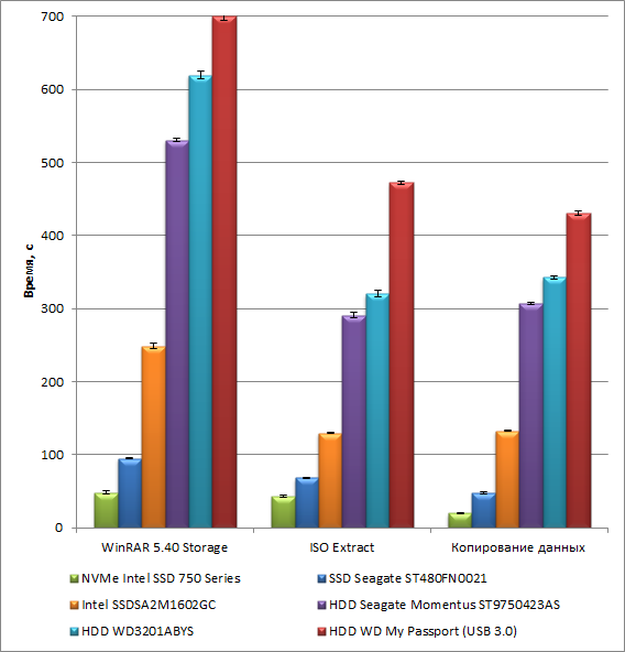 Как видно по результатам, время выполнения теста для различных накопителей может отличаться более чем в 10 раз. Результат очень показательный и позволяет наглядно продемонстрировать преимущества быстрых SSD-накопителей над медленными HDD.