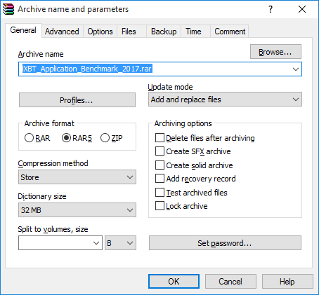 Как мы уже отмечали в предыдущей статье, приложение WinRAR можно с успехом использовать и для тестирования процессора, и для тестирования накопителя. Чтобы создать высокую нагрузку на накопитель, можно использовать приложение WinRAR не для сжатия данных, а для упаковки множества отдельных файлов в один большой архив без сжатия. Для этого достаточно использовать метод компрессии Store (без сжатия).