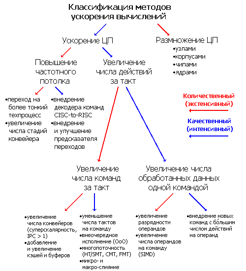 Всё время существования вычислительных машин, начиная ещё с арифмометров, создатели всегда хотели их ускорить. Какими способами у них это получалось и получается? Разумеется, никакого основного метода увеличить скорость вычислений нет, одновременно применяются почти все из до сих пор найденных. Поэтому для классификации потребуется разделение на качественные (интенсивные) и количественные (экстенсивные) ускорения. Разделение весьма условное — чёткой границы между методами повышения производительности нет, да и внутри себя они тоже делятся на разные подклассы. Т.к. за обработку данных отвечает один или несколько центральных процессоров (ЦП), а производительность является его/их главной характеристикой — большинство способов так или иначе касаются именно этой части системы. Заранее предупредим, что под процессором мы понимаем микросхему с корпусом и выводами, вставленную в разъём (сокет).