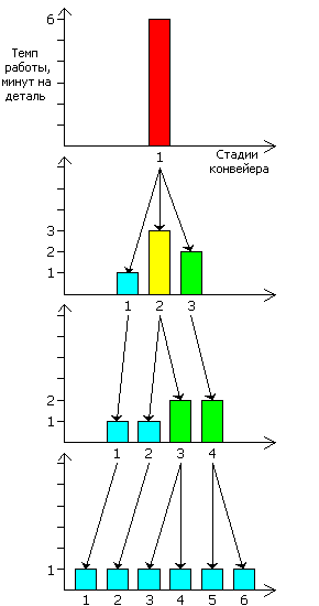 Рассмотрим для примера заводик, выпускающий некую деталь. Пока на нём 1 станок, обрабатывающий заготовку за 6 минут. Производительность — 10 деталей/час. Однако процесс можно разделить на 3 отдельных слабо связанных этапа, которые можно выполнять одновременно над тремя деталями — каждая на своей стадии. Ставим три станка вместо одного: первый над каждой деталью работает 1 минуту, второй 3 и третий 2. Общая производительность конвейера ограничивается самой медленной его частью — вторым станком. И хотя остальные часто простаивают, наш заводик выпускает уже 20 деталей/час. Чтобы оптимизировать конвейер, следует сделать работу его стадий максимально равномерной — передать часть работы со второго станка на первый так, чтобы оба работали за 2 минуты. Однако это не всегда получается, зато обнаруживается, что мы можем самую медленную часть системы («бутылочное горлышко») разделить на 2 этапа — пускай по 1 и 2 минуты каждый. Теперь у нас 4 станка с темпом работы 1, 1, 2 и 2 мин., соответственно. Всё бы хорошо, но количество железа увеличилось вчетверо, а вот скорость работы — всего втрое. А не нарезать ли нам конвейер ещё помельче — поставим 6 станков, работающих по одной минуте. Теперь мы затратили 6-кратное количество средств производства и получили 6-кратный выход продукта.