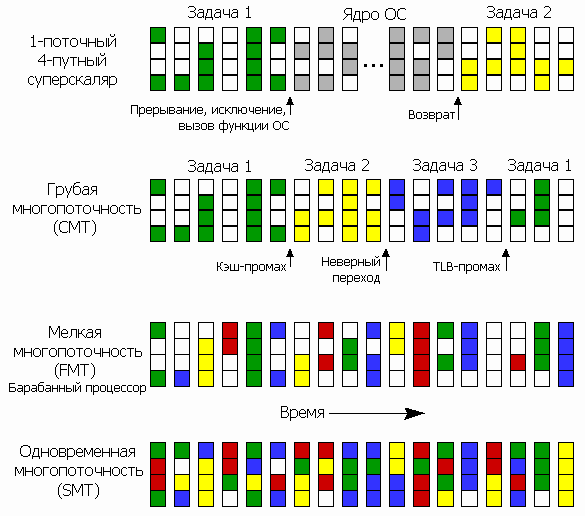 Но и эти методы недостаточны, когда происходят такие рушащие производительность события, как неверно предсказанный переход, кэш-промах (запрошенная информация не закэширована), долго исполняющаяся команда и т.п. — при заторе в одной стадии остальные ждут, пока нужный ресурс станет доступным. Тогда между стадиями добавляют многочисленные буферы и очереди, сглаживающие разницу в производительности отдельных этапов и поддерживающие на плаву весь конвейер первые несколько тактов после фатального затора. А дальше всё равно надо откуда-то брать команды и данные. И если с текущей программой мы ничего сделать не сможем, пока не рассосётся затор, — может, переключимся на другую, раз уж все процессоры многозадачные?