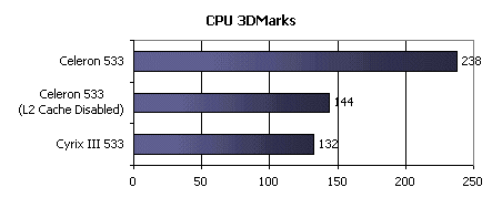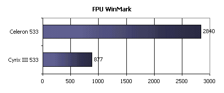 А вот где Cyrix III показывает себя настоящим тормозом, так это в FPU WinMark, который показывает "чистую" скорость работы арифметического сопроцессора. Да, почти троекратное отставание от Celeron процессор от VIA совсем не красит. Видимо, разработчики IDT так и не смогли справится с давно стоящей перед ними задачей проектирования быстрого арифметического сопроцессора.