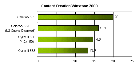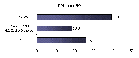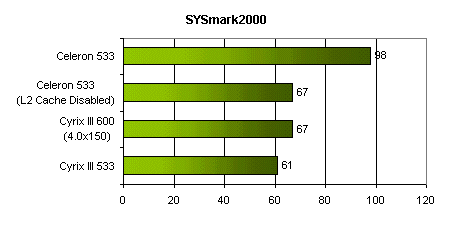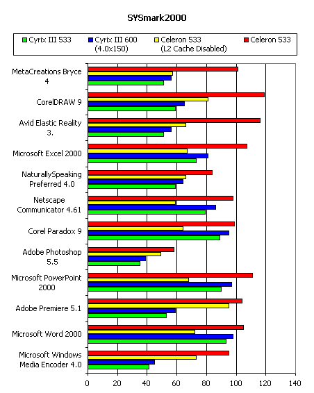 Помимо процессоров, работающих в стандартных режимах, я включил в результаты показатели, демонстрируемые процессором Cyrix III, разогнанным до 600 МГц увеличением частоты системной шины до 150 МГц и процессором Celeron с отключенным кешем второго уровня.