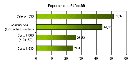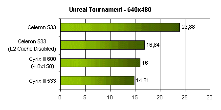 В Unreal Tournament результат Cyrix III по сравнению с Celeron выглядит несколько оптимистичнее, однако 14-15 fps в разрешении 640x480 вряд ли может служить поводом для оптимизма. Пожалуй, на использовании Cyrix III в игровых системах можно ставить крест.