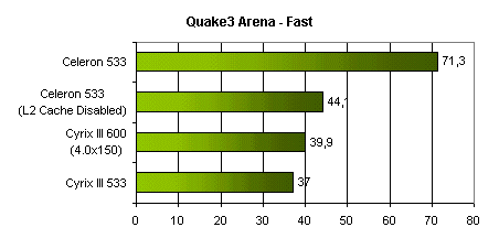 Пришло время обратить внимание на скорость Cyrix III в игровых приложениях. Однако, как в общем-то и ожидалось, результаты у него достаточно скромные. Так, в Quake3 этот процессор отстает от Celeron почти в два раза. Неутешительный результат, объясняемый медленным FPU.